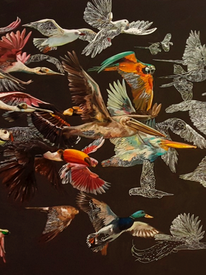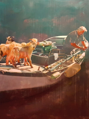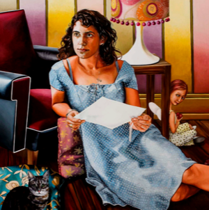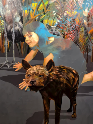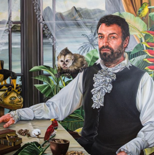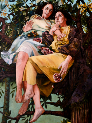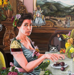 The universe of my paintings is populated by real and/or imaginary beings, each wearing different characters that create a moment, a situation. These lead and invite the observer into action. I explore various themes, from folk tales to current issues, using a questioning tone. Human and botanical elements are always present in a bond between the terrestrial and the celestial.